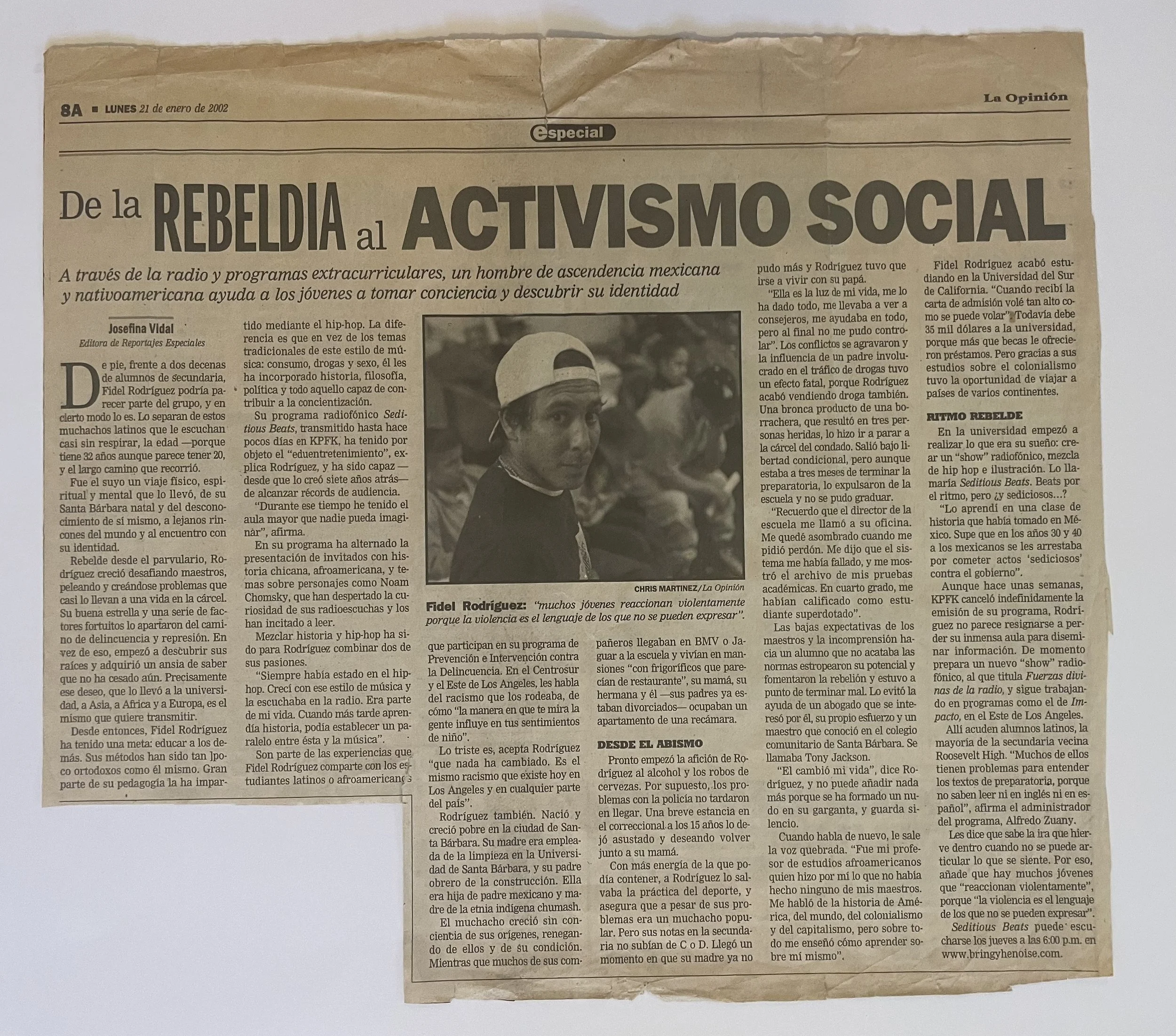 · divine forces radio /Seditious Beats & Fidel Rodriguez also have received awards for their commitment to social and community issues from United States Congresswomen Maxine Waters for "years of dedication to raising consciousness, promoting unity and providing our youth creative avenues for positive change through the radio airwaves” and former State Senator Tom Hayden for their “enormous and continuous efforts to touch and transform lives through conscious radio”.